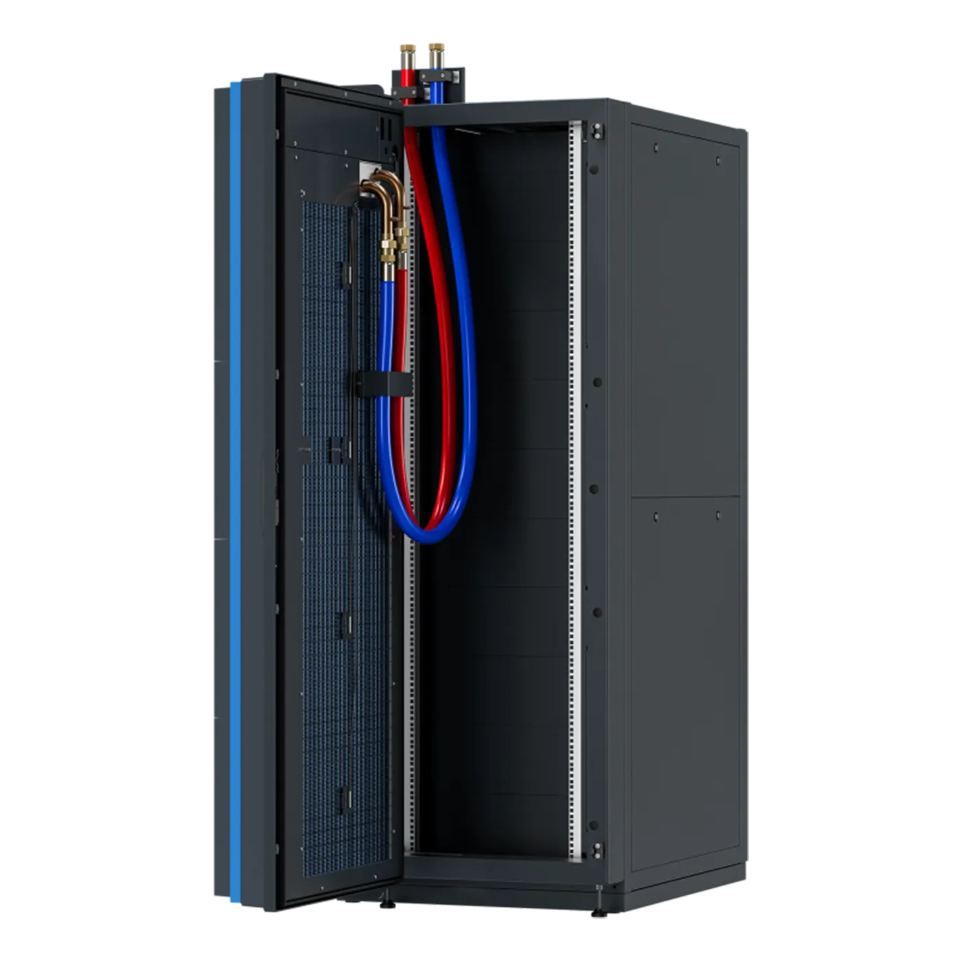 A HiRef Rear Door Cooling (RDC) rendszer a rackszekrények hátoldalára szerelhető, 180°-ban nyitható hűtőajtóval biztosít hatékony, rack szintű hűtést, miközben teljes hozzáférést nyújt az IT berendezésekhez karbantartás vagy bővítés során. A hő közvetlenül a keletkezés helyén kerül elvezetésre, így csökkenthető a meleg levegő visszakeveredése az IT térbe, javul az energiahatékonyság, és stabilabb működési környezet alakítható ki nagy sűrűségű adatközponti alkalmazások esetén.